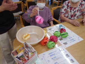 こちらも夏の定番”ヨーヨー釣り” 笑いながらも真剣です…